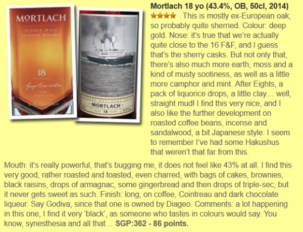 Die Nummer drei auf der (anscheinend) nach oben offenen Preisskala ist der achtzehn Jahre in Fässern gelegene Mortlach. Auch hier die beliebte Stärke von 43,4 %.